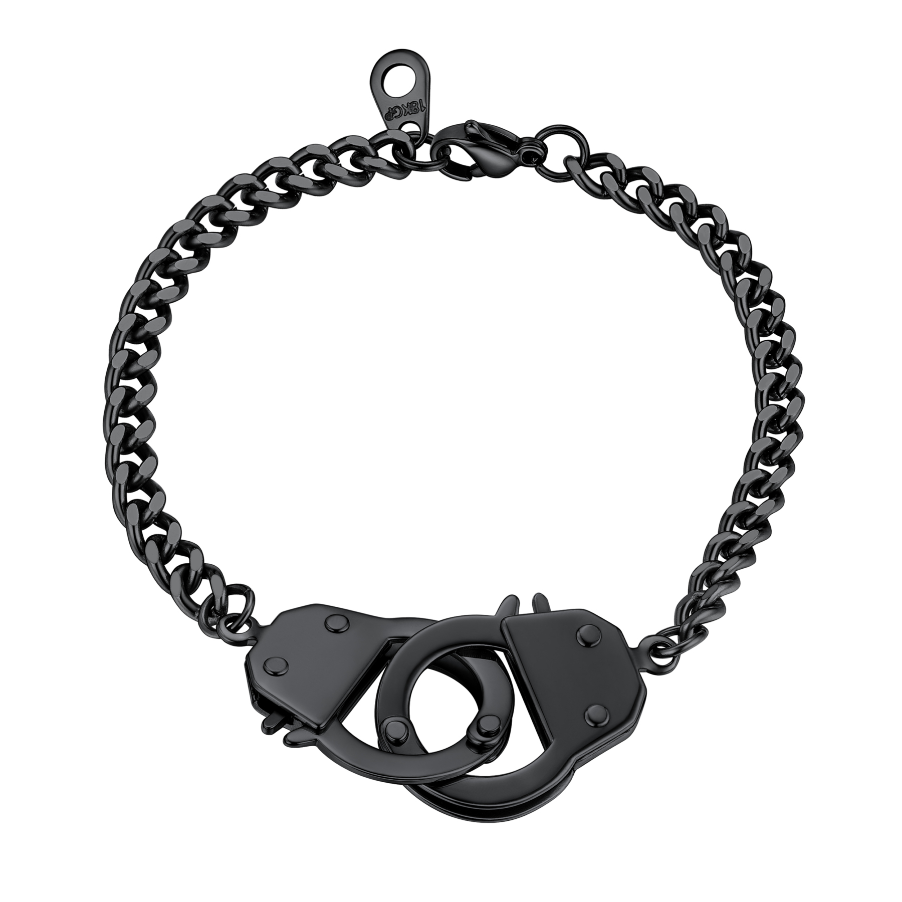 Featuring a stylish handcuff pendant on a durable curb chain, this bracelet combines edgy style with everyday comfort. Made from high‑quality stainless steel that resists tarnishing and fading, the piece is designed for daily wear—whether worn alone for a bold statement or layered for a personalized look. Its polished finish and secure lobster‑claw clasp ensure lasting shine and easy wear.