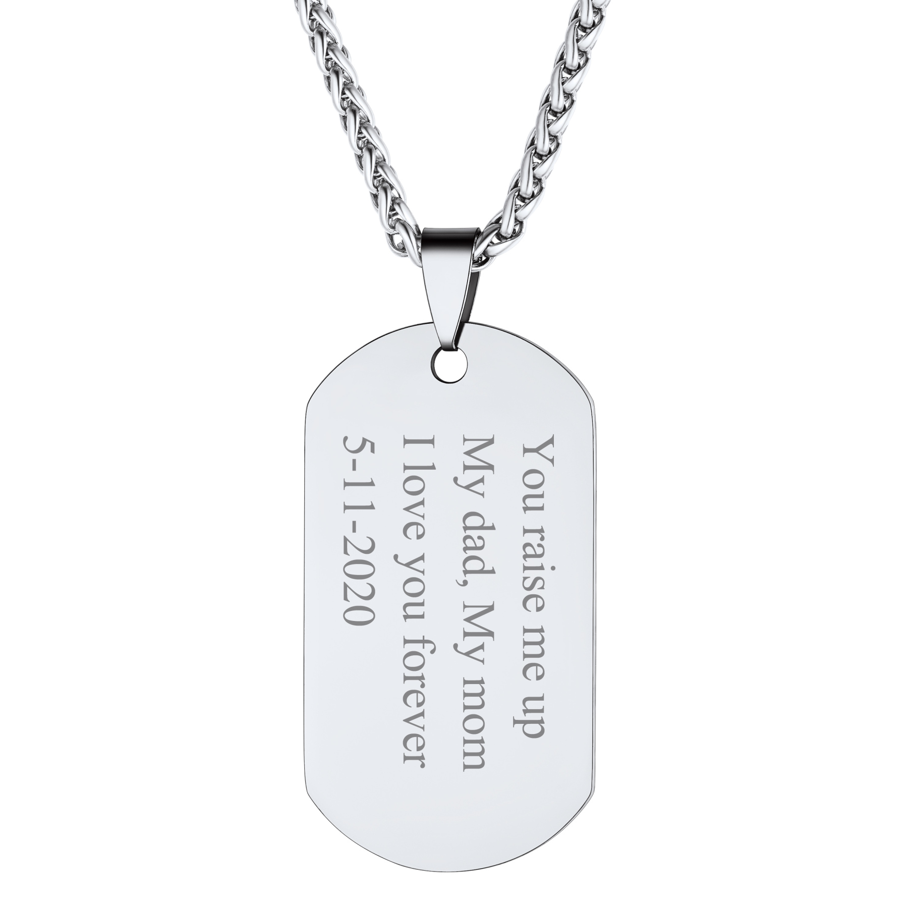This Personalized Dog Tags Necklace features black text on a custom-engraved pendant, creating a bold and unique statement. The 22-inch chain with a secure lobster clasp ensures a comfortable fit, making it a versatile accessory for both men and women in various daily occasions. The 26g weight provides a substantial feel, while the durable stainless steel construction guarantees long-lasting wear.